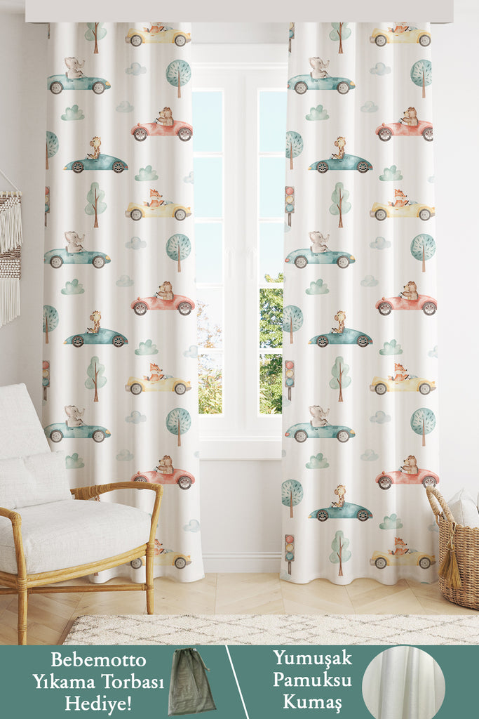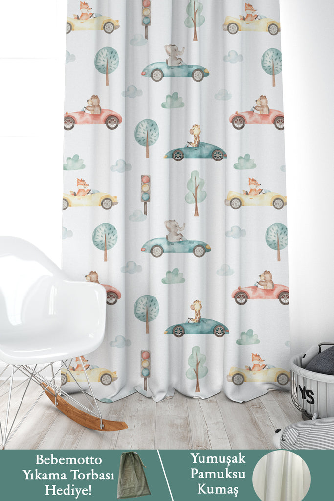 Sulu Boya Efektli, Safari Hayvanları Bisiklet, İthal Kumaş, Çocuk ve Bebek Odası Fon Perde - 2 Kanat