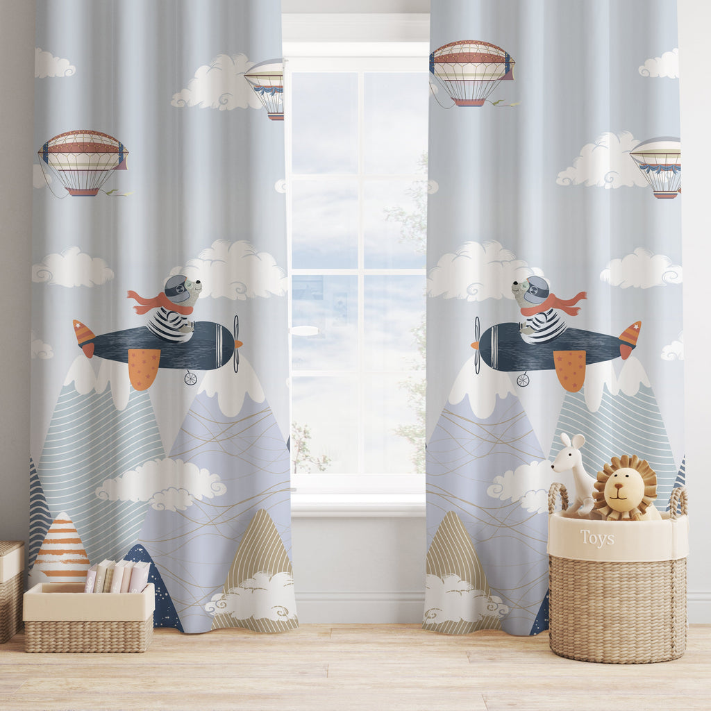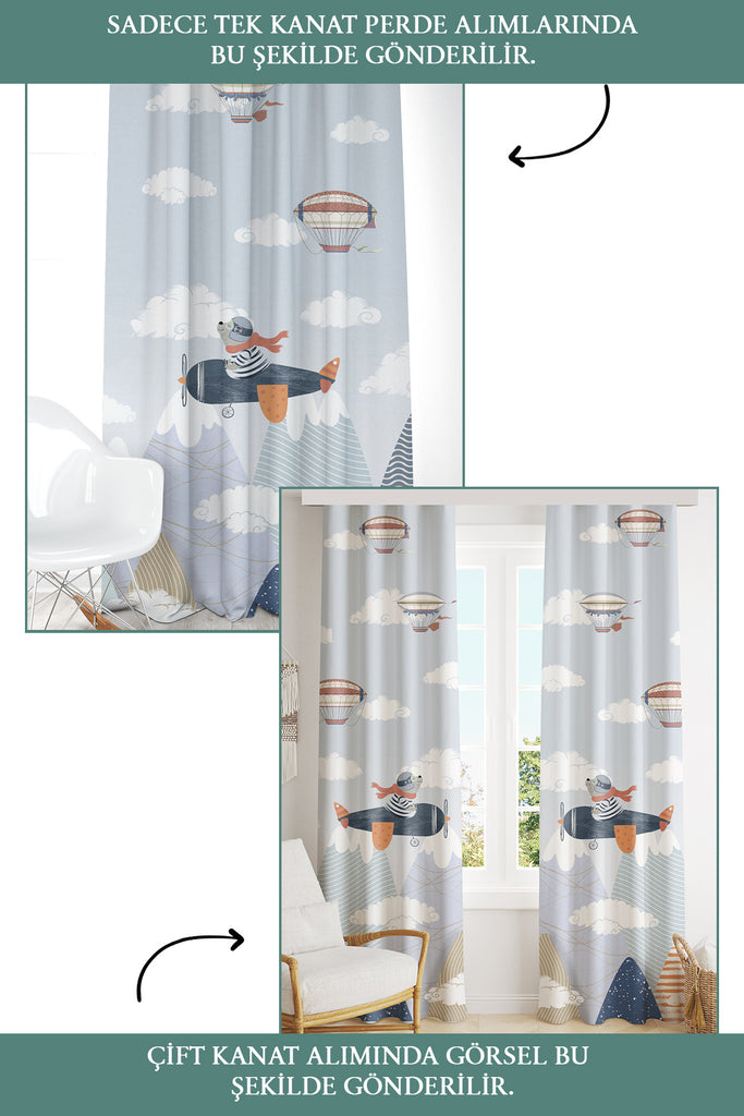 Tekli Pilot Ayıcık, İthal Kumaş, Çocuk ve Bebek Odası Fon Perde - 2 Kanat