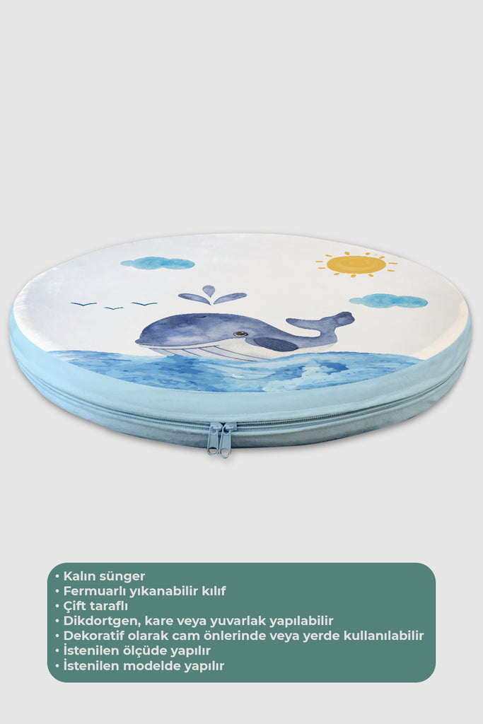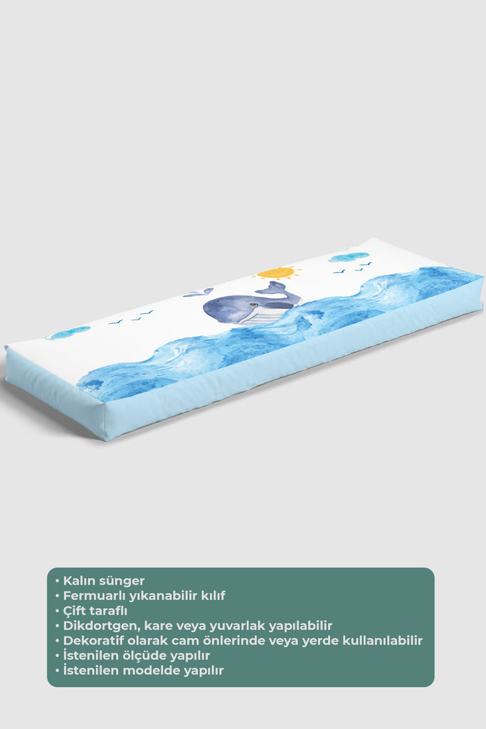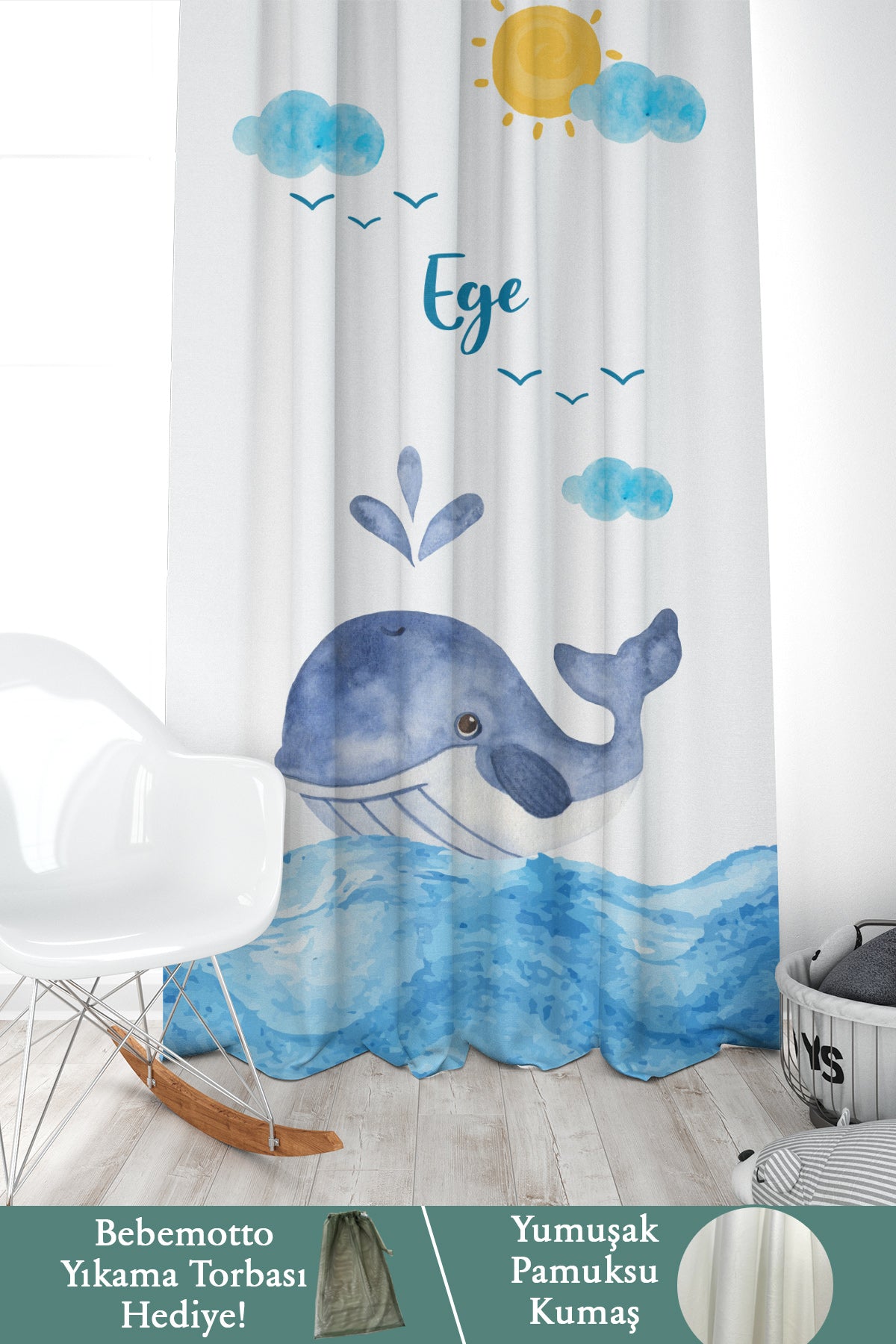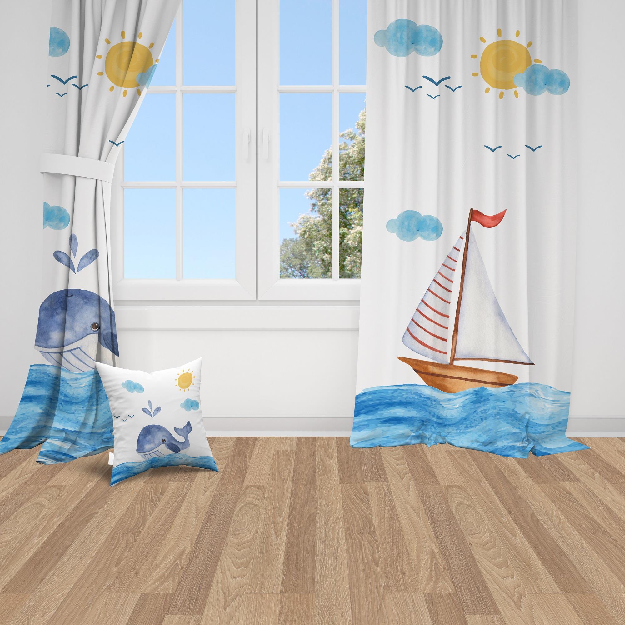 Sulu Boya Efektli, Deniz, Balina ve Gemi, İthal Kumaş, Çocuk ve Bebek Odası Fon Perde - 2 Kanat